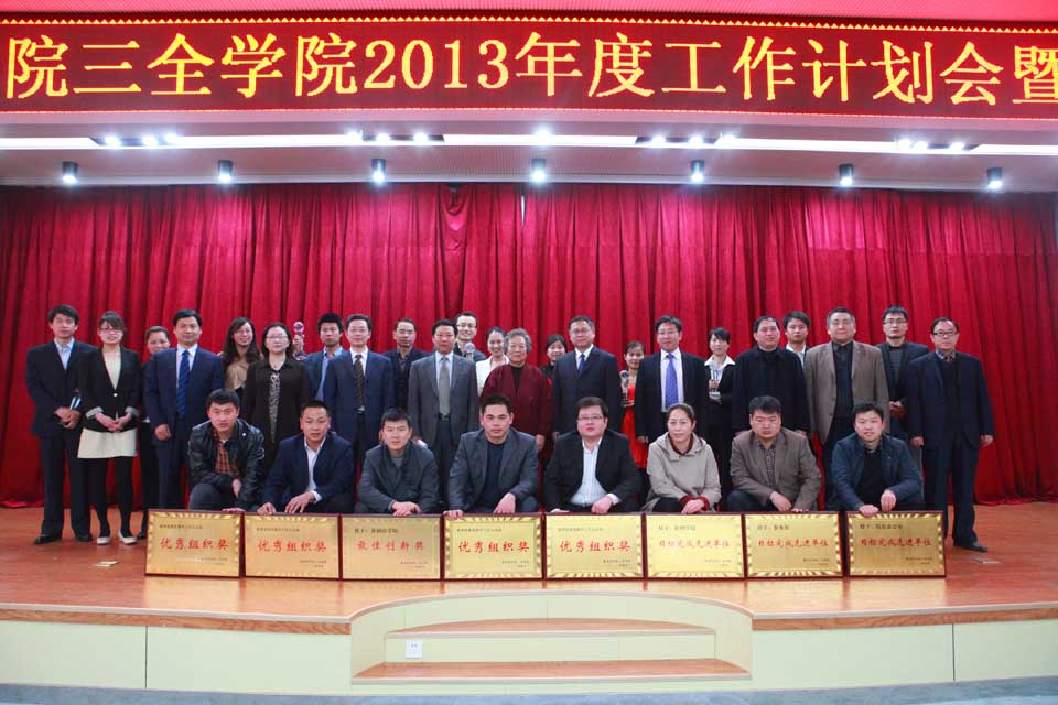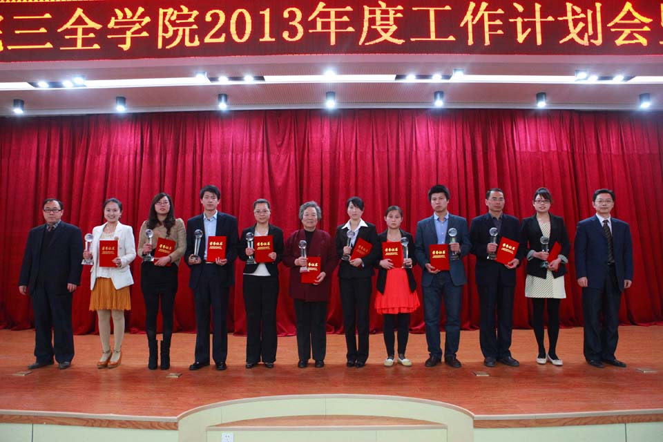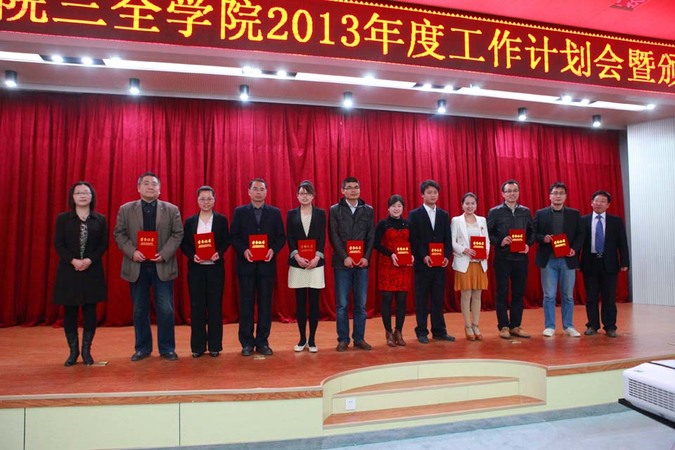 芳菲四月百花争艳,激情昂扬三全同欢。4月11日下午,学院问学楼学术报告厅气氛热烈,济济一堂,以“汇聚正能量  共筑三全梦”为主题的2013年度工作计划会暨颁奖典礼在这里隆重举行。院领导王志凯、杨捷、王金文、秦国亮、王维勋、王彦杰、沈雁霞出席,全体教职工参加,院长办公室主任史世锋主持。 大会在沙画视频《三全梦》中拉开帷幕,首先对学院2012年度工作中表现优异的单位及个人进行了表彰。思想政治理论课教学部等四个单位、崔永斌等十位同志,以在学院教育思想及教学工作大讨论活动中的优异表现,获得教育思想及教学工作大讨论活动优秀组织奖和先进个人奖。李灵敏、裴丽华、万建苗等十位同志以立足岗位、扎实苦干、倾心奉献的工作态度和突出的工作业绩,赢得专家评审的认可和全院教职工网络投票的支持,从三十六位候选人中脱颖而出,被评为“年度十佳人物”。教务部、基础医学院以开拓的思路、创新的工作成果,荣获“年度最佳创新奖”。教务部、护理学院等四个单位,以科学的管理、精密的分工、团结协作和求真务实的精神,以及丰硕的工作成果,被评为“年度目标完成先进单位”。受到表彰的单位和个人以昂扬向上的精神风貌和全力付出的行动,成为三全精神的诠释者和传承者,有力的发挥出先进典型的引领示范作用。 颁奖典礼结束后,杨捷作重要讲话。他首先代表学院向获奖的单位和个人表示热烈的祝贺!对执着耕耘在教学一线的老师们、拼搏奋进在管理、服务岗位上的同志们,表示最衷心的感谢!简单回顾学院2012年工作之后,他指出,2013年,是迎接教育部评估验收,实现战略发展的重要一年,学院将要在新的历史起点上,实现一校两区的办学新格局。他说,学院工作的总体思路是:以独立学院规范健康发展为契机,以立德树人为主题,以促进教学条件改善、教育质量提高、办学水平提升为重点,以战略管理、绩效考核为抓手,以党群建设为保障,实施“质量立校、人才强校、机制活校、特色兴校”发展战略,快速推进新校区建设、教学质量提升、师资队伍建设、支撑保障体系建设、大学工体系建设、大学文化建设六项工程。 接着,杨捷对学院评建工作、教育教学质量提升、师资队伍建设、校园基本建设、管理体制改革创新、学生管理工作特色化、大学文化建设、党建建设等八个方面的工作,做了重要部署。他突出强调迎接教育部评估验收是一场硬仗,全体三全人要扛住压、顶全力,不仅要打赢,还要打的漂亮。而其中的核心要素,就是平原校区的建设,学院能否成功拉开一校两区新格局,争取发展的新空间,关键在此,没有退路。图书馆建设步伐也要加快,要邀请美国顶级图书馆咨询顾问来院指导,和世界一流图书资源供应商合作,建成一流的数字化、现代化图书馆。杨院长还强调,2013年是学院管理体制的改革创新年,我们要在完善顶层设计的同时,践行专家治校、教授治学的管理理念,加强制度建设,深化目标管理工作,提高财务保障力和后勤服务水平。还要以学生管理体系改革为突破口,构建起以咨询、服务、活动三大职能为框架的学生工作新体系。 之后,王志凯就学院2013年党风廉政建设工作作重要讲话。他指出党风廉政建设工作的重要性,并强调大家要加强学习,提高认识,增强抓好党风廉政建设的自觉性;要大力推进“阳光治校”,加强反腐倡廉建设;要落实责任,强化机制,把党风廉政建设任务落到实处,引导全院各级干部,把心思和精力用在推动发展上来,用各级干部的“辛苦指数”来提升广大师生员工的“幸福指数”。 王金文还就学院2013年度的宣会文化工作做了部署,他强调学院今年的宣传文化工作要坚持“占领高地,开拓创新,突出重点,彰显特色”的工作思路,实现思想引领工作有新进展,对外宣传思路有新转变,对内宣传水平有新提高,大学文化建设有新突破。 本次大会明确了学院各项工作的前进方向,增强广大教职员工为学院明天更美好而凝心聚力,拼搏奋进的信念与斗志。