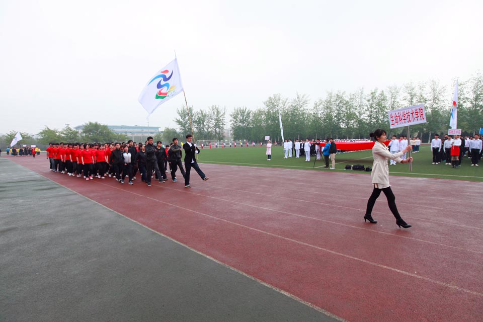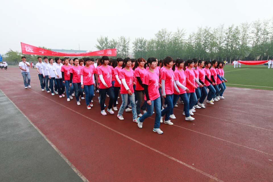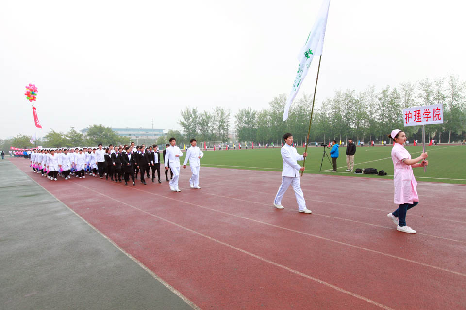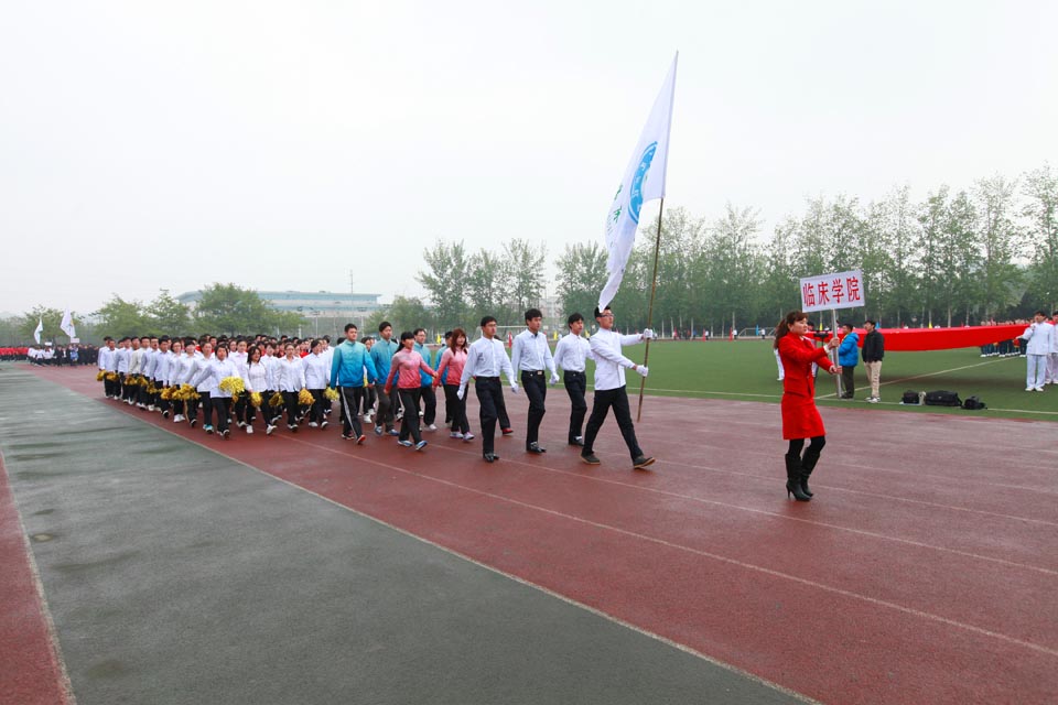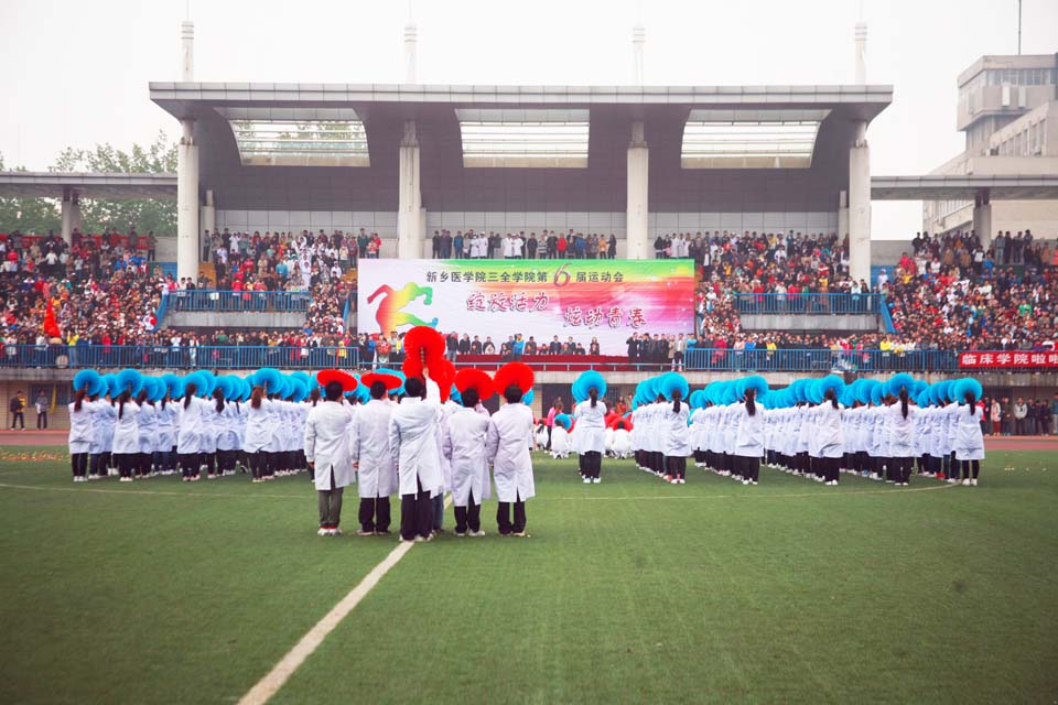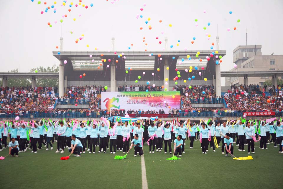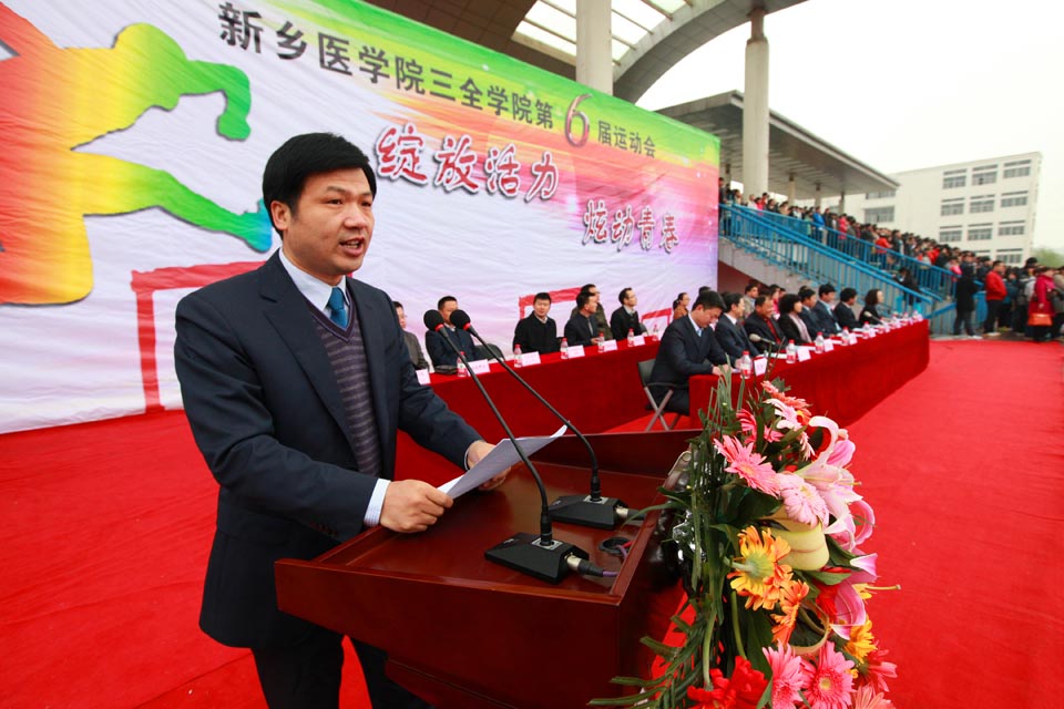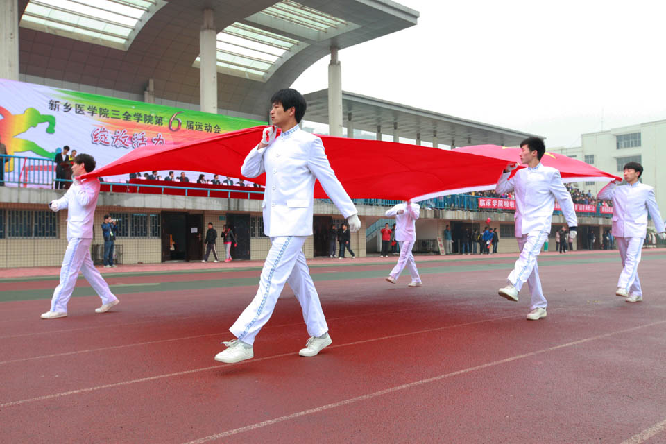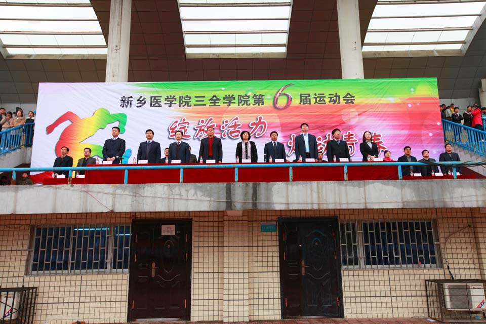 春风绿牧野,运动扬激情。4月20日上午,我院第六届运动会在东区体育场隆重开幕。新乡医学院副院长毛兰芝,新乡医学院体育教学部主任杨晓林、副主任王苏杭,我院党委书记王志凯,党委副书记王金文,副院长秦国亮、王彦杰、沈雁霞与各院系、职能部门负责人出席,全体师生参加。院长办公室主任史世锋主持开幕式。 伴随《运动员进行曲》,国旗班、花束队及8个学院代表队、教职工代表队步伐整齐,口号激昂,依次进入会场。 我院体育运动委员会主任、本届运动组委会主任王彦杰致辞。他代表学院及大会组委会,向运动员及参与筹备组织工作的师生表示感谢。王彦杰说,体育增强体质,启迪智慧,是彰显生命力、实现全面发展、增进了解交流的重要方式。大学体育既是竞技体育发展的重要途径,也是公众了解大学的重要窗口,是大学扩大社会影响力和提高知名度的重要途径。我院始终重视体育事业的发展,重视竞技体育水平的提高,重视全民体育、全员参与阳光体育运动的积极落实。在过去的一年里,我院获得华光体育活动多项殊荣,这都是我院运动健儿锐意进取,不断超越的结果。 王彦杰指出,体育赋予我们勇敢与激情,带给我们快乐与健康。运动会只是一个平台,真正的意义是让我们用智慧与技能,跨越障碍,超越自我,分享运动会的魅力和欢乐,让青春活力散发于赛场上的每一个角落。他预祝我院第六届运动会圆满成功。 参赛运动员及裁判员代表宣誓。  王志凯宣布新乡医学院三全学院第六届运动会开幕。 随后举行各院系的团体操表演,各项比赛依次进行。 本届运动会持续两天,共有学生1359人,教职工236人参加。
