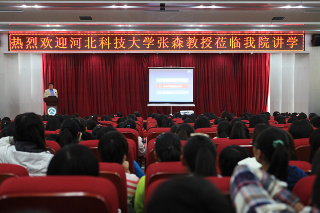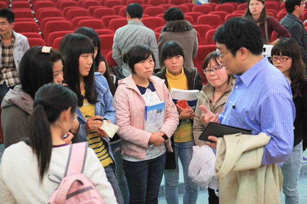 为提高我院大学生对四六级测试题型改革后的认识,从容应对12月份的四六级考试。11月4日至5日,我院特邀河北科技大学外国语学院教授、教育部高等学校大学外语教学指导委员会委员、全国大学英语四、六级考试委员会委员张森,在平原校区和新乡校区开展了两场以“四六级测试题型变化及其对大学英语教学的反拨”为题的讲座。外国语言学系主任王秀琴,党总支副书记赵元雪、相关教研室老师及一千余名学生共同聆听了报告。 张教授的讲座以今年四六级测试题型变化为切入点,从题型试卷描述,题型分析说明,分数划分比重及发展趋势等方面详细介绍了今年英语四六级考题的“变与不变”,从考题入手,分析了今年英语四六级测试题型转变及其对大学英语教学的反拨。以实题为例,从学生如何调整学习策略,教师如何转变角色等方面做出了详细的讲解。张教授建议大家改变以往学习英语的方法,尝试新的学习方法,提高英语听说读写综合的能力。 最后,张教授与在场同学积极交流,对同学们提出的问题一一认真做出解答,现场气氛热烈。