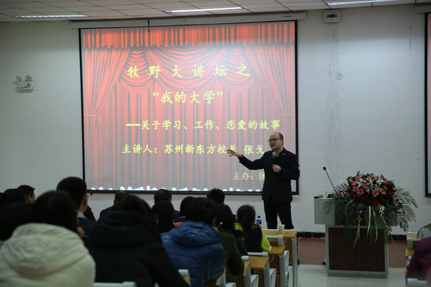 3月6日晚,我院2014年首场牧野大讲坛之“我的大学”在平原新校区第一教学楼D1大教室举行。本次讲座特邀苏州新东方校长张戈担任主讲。我院院长杨捷出席了本次活动。 讲座期间,张戈结合个人求学及工作经历,与同学们分享了他学习、工作、恋爱的感受。他以“爱心、诚实、有上进心”三个优秀品质作为他对自己选择员工的标准来教导大学生,并激励同学们要珍惜自己的大学时光,踏实学习,丰富生活。最后提问环节中,同学们积极踊跃与张戈校长进行面对面交流,提出自己在学习、生活中的种种困惑,他都一一耐心细致解答,并给予了同学们莫大鼓励,赢得在场同学们的阵阵掌声。 院长办公室主任史世锋、团委书记王俊萍,以及来自各个院系的500余名师生共同参加了本次讲座。