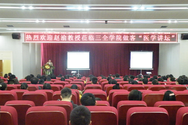3月8日上午,重庆医科大学附属第一医院管血管外科主任、博士生导师赵渝教授莅临我院做客“医学讲坛”,讲述“外科的起源与发展”,描绘“医生的成长”。学院党委副书记王金文出席了本次活动。 赵渝教授结合自身从医三十年的经历,以多个视角幽默风趣地介绍了西医外科的起源、当代外科学的发展。对于如何做好一名医生,赵渝教授说:“医有缘之人,治可愈之病,救危难之命,显医者仁心。集众人之力,倾仁爱之心,患者无怨医者无悔,有此修为者方可为大医”。对于时下热议的医患关系,赵渝教授说:“要相信未来,不因不公而怠慢,不因抱怨而失信,不因误解而不为,终因至诚而和谐”。 互动环节,赵渝教授针对同学们提出的关于实习与考研的问题给予了很好的建议。讲座持续了近三个小时。活动最后,赵渝教授高度肯定了我院学子的专业素质,并非常高兴邀请我院学生去重庆医科大学管血管外科参观实习。 临床学院党总支书记朱坤以及500多名学生聆听了此次讲座。