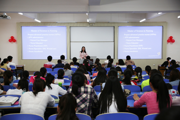 郭璠老师从加拿大对考取注册护士的要求、护士考级程序和申请加拿大注册护士的基本流程等三个部分进行介绍。她结合自身的工作经历发表自己的独到见解,提醒大家在注册过程中的注意事项。关于护理梦想,郭老师讲到:“你想飞多高,天空就有多大。我的人生就是在不断飞翔,不断第收获。世界各地,护士都将会有更多的机会,护理行业也会有更大更广阔的空间,关键在于作为护士的我们要有一个热爱职业、奋发进取的心”。同时,她通过照片展示的方式向大家讲述了自己在加拿大的工作、学习、生活情况。在接下来的学生自由提问环节,针对同学们提出的关于国内外护理体制的不同之处,国外医疗卫生待遇、工资待遇,在国内是进入临床工作,还是继续深造等问题,进行了耐心解答。最后,她希望同学们在以后工作中,要做到责任到位、权利到位、计划到位,并鼓励大家积极努力学习,争取得到更多走出国门,放飞未来的机会。