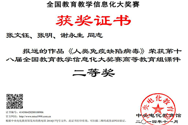 我院张文钰、张明、谢永生的《人类免疫缺陷病毒》,获得全国教育教学信息化大赛高等教育组课件类二等奖;金白洁、盛海燕、陈改英的《跨膜物质转运》获得课件类三等奖;王秀菊、郭亚萍、胡亚平的《对映异构及其投影式》获得微课类三等奖。