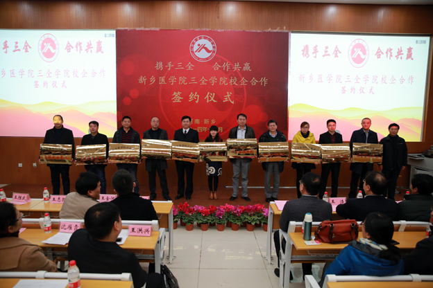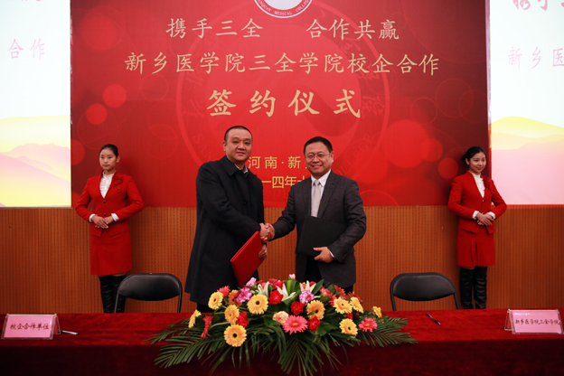 12月11日上午,我院与北京京都宝岛眼镜有限公司等11家企事业单位在平原校区第一教学楼D2大教室隆重举行“携手三全 合作共赢”校企合作签约仪式。 河南省卫生厅科教处处长王金河,河南省人力资源和社会保障厅职业能力建设处处长王浩,河南省人力资源和社会保障厅职业能力建设处职业技能鉴定指导中心副主任李伟杰,河南省教育厅大中专学生就业服务中心培训市场信息部主任张超,德迅(上海)投资管理有限公司总经理李志,上海创实医疗科技有限公司大区经理王文星,步长集团人力资源部部长韩怡,北京京都宝岛眼镜有限公司副总经理卢献赋,河南宝视达眼镜(连锁)有限公司人力资源部经理张瑞娟,温县人民医院副院长郭电渠,开封光明医院院长郭书文,天津嘉氏堂科技有限公司人力资源部经理张涛,西安明淑思妍美容医疗科技有限公司人力资源部经理齐宝兰,引胜义齿科技有限责任公司经理许黎青,郑州市第十六人民医院副院长王胜武,我院党委书记王志凯、院长杨捷、副院长王洪兴、沈雁霞出席,相关职能部门负责人、各院系及书院有关领导参加签约仪式,仪式由我院副院长王彦杰主持。 在隆重热烈的氛围中,现场师生一起观看了合作单位的宣传片,了解各单位的概况与发展历程。 杨捷致开幕辞。他对出席本次仪式的各位领导、嘉宾和合作单位代表表示热烈欢迎。他从学院概况、办学理念、学院发展战略、校企合作主要模式以及合作发展方向探索四个方面发表讲话。杨捷说,三全学院是省内唯一的医学类独立院校,办学来一直秉承“全面适应社会需求,全面实施素质教育,全面培养医学英才”的办学指导思想,不断创新发展,显著的办学成果得到了各级领导一致肯定。我们将深入贯彻郭庚茂书记莅临我院时的讲话精神,努力把三全建设成高水平、有特色、健康服务综合性大学。关于本次校企合作,杨捷表示,我院将采取学生、企业、学校三方互利共赢的订单式培养,提高学生就业率。同时通过行业引导下的校企合作、“双师型”教师一体化培养和多措并举持续深化顶岗实习模式来推动校企合作。对于以后合作的发展方向,杨捷指出,我院将采取深化学研互融合作、逐步实现递进式合作等四项模式加强与企业间合作。最后,杨捷说,本次校企合作将掀开我院发展新的一页,对我院战略转型起到极其重要的推动作用,将成为我院发展史上的里程碑。 王金河发表讲话。他说,本次校企合作签约仪式充分体现了三全学院对学生高度负责的办学精神,紧随时代发展步伐,紧扣社会需求,符合卫生事业发展的实际需要。校企合作符合国家对教育的要求,能有效地把握市场人才需求,提高学校的市场适应能力。王金河认为,我院毕业生吃苦耐劳、爱岗敬业,具有合格的专业技能,已成为我省基层医疗单位的中坚力量,希望我院能培养出更多医学人才,为医疗卫生事业作出更大贡献。 王浩和张超分别致辞。王浩在充分肯定了我院校企合作取得的成效后说,加强校企合作,是当前经济社会发展的迫切需要,是职业教育改革与发展的必然选择,也是企业提高员工队伍素质、增强企业竞争力的基础和关键,要充分认识加强校企合作的重要意义,加强宣传教育,强化组织引导,完善机制模式,落实政策措施,进一步加快校企合作步伐。张超为我院在各方面取得的显著成绩以及勇于尝试、敢于突破的精神感到十分高兴,他希望参会的企业能与我院在实习实训、产教融合、就业安置等方面合作共赢,在校企合作上开创新局面。 企业代表卢献赋在仪式上高度评价我院毕业生,他说:“三全的学生都是一级棒。”他表示,今天的成功签约将标志着宝岛眼镜与三全学院的合作正规化、全方位化,今后将进一步开展多层次、多形式、多领域的合作,共同把学生培养得更好。 杨捷先后与各企业代表在校企合作协议上签字,王志凯为合作单位授牌。会后,企业代表参观了我院平原校区,并就人才需求问题与学院领导进行了探讨和交流。