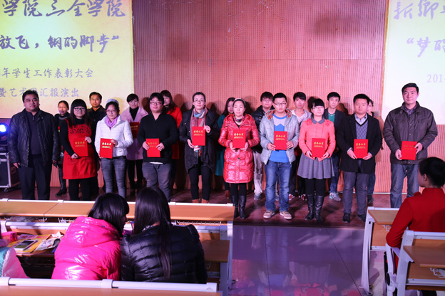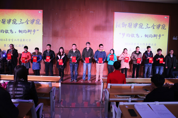 1月8日,我院“梦的放飞,钢的脚步”2014年学生工作总结表彰大会暨艺术团汇报演出在平原校区第一教学楼D2大教室隆重举行。我院党委副书记王金文、张钢出席会议,学生事务发展部、教务部、总务部等相关职能部门负责人,各书院党总支书记,以及教职工代表和获奖学生代表参加了本次大会。 岁月不居,天道酬勤。过去的一年,我院紧紧围绕学工体系改革这一学院重点工作,全体师生团结奋战,各项工作都取得了优异的成绩。本次表彰大会共评出24个奖项,分别是2014年暑期社会实践优秀团队2个,优秀指导教师25人;2014年优秀辅导员10人,优秀学生工作者10人;2014年先进班级体35个,三好学生337人,优秀学生干部135人;河南省优秀服务团队2个,河南省优秀辅导教师1人,河南省先进工作者3人,河南省先进个人8人,河南省优秀社会实践者2人等。 会上,张钢作总结讲话,他对受到表彰的优秀单位、优秀教师和学生代表表示热烈的祝贺,向多年来工作在学生工作战线的老师们表示衷心的感谢,并希望广大师生以这次总结表彰为起点,从我做起,从现在做起,勤于学习,进一步开创学生工作的新局面。会后,我院领导、教职工代表和获奖学生代表观看了艺术团的汇报演出。