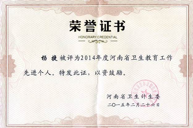 近日,河南省卫计委下发《关于表彰卫生教育工作先进单位和先进个人的通知》(豫卫科教〔2015〕7号),我院院长杨捷获得“河南省卫生教育工作先进个人”荣誉称号。