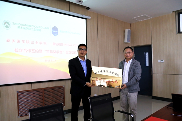 5月12日上午,我院与星创视界(NOVA VISION)校企合作协议签约暨“宝岛奖学金”设立仪式,在平原校区隆重举行。此次签约,标志着双方建立了稳固的战略合作伙伴关系,为学院向应用技术型大学持续、健康、快速转型奠定了良好基础。 上午9时30分,星创视界宝岛眼镜总经理魏举、宝岛眼镜(郑州)副总经理邓仁丙、宝岛眼镜总部专业事务部主管连捷、宝岛眼镜(郑州)指教部主管马俊磊一行四人来到学院,并参观了学院第一教学楼。随后,一行人来到C303教室,与我院眼视光专业学生进行了关于视光行业未来发展的互动讨论。 下午14时30分,院长杨捷、副院长王洪兴在基础楼四楼会议室,接见了星创视界一行人,双方就未来合作的发展方向及合作的细节进行洽谈。杨捷和王洪兴分别致辞,并表达了建立长久合作的良好愿望及对未来合作共赢的信心。随后,双方签订了校企合作协议。杨捷与魏举互授“新乡医学院三全学院实践就业基地”与“星创视界(中国)产学研基地”牌匾。签约仪式在和谐融洽的氛围中圆满结束。 在此次签约仪式上,双方本着自愿、平等、诚信、共赢的原则,建立了新型战略合作伙伴关系。双方将在视光领域展开深层次的交流与合作,共促校企快速健康地发展。