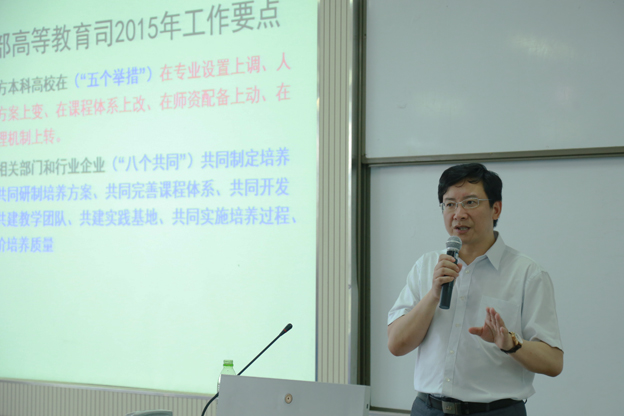 6月25日,教务部联合发展战略与考核部在平原校区B103教室举办应用技术型健康服务业大学转型发展讲座。特邀常熟理工学院顾永安教授,为全院教职工做《地方本科院校转型发展的重要研判与实践探索》的讲座。院长杨捷、党委副书记王金文、副院长王彦杰、党委副书记张钢、副院长沈雁霞出席会议,学院各单位300余名教职工聆听讲座。会议由王彦杰主持。 首先,王彦杰对顾永安教授莅临我院指导访问并举办讲座表示热烈的欢迎。随后,王彦杰从我院现状分析、国家相关政策,到我院转型思路、转型目标进行了阐述,并向全体参会教职工隆重介绍了主讲人顾永安教授。大家再次对他的到来表示热烈的欢迎。 讲座开始,顾永安教授从转型是痛苦的、艰难的、必须的、成功的,四个方案阐述了目前新建本科院校转型发展的核心问题。他从一所地方或行业高校的战略选择是什么引起大家思考,高校根本任务是培养学术型人才和应用型人才,而要培养出什么样的人才是高校办学的核心问题,也是高校办学思路和转型发展的根本所在。接着,顾永安从地方本科院校转型发展的基本认识、顶层设计、内涵建设及若干问题等四个方面进行详细阐述。首先,顾永安介绍了我们国家现行的政策法规和国家领导人对职业教育的重视,阐述了高校走转型道路的必要性。 其次,他从我国现实存在的人才供需错位、高校转型困难,以及内外部、主客观存在的多重原因分析了我国高校转型问题,并指出高校转型的关键是形成校企合作、产教融合的新常态。他说高校转型需要国家出台相应政策扶持,搭建平台促进交流,地方政府提供帮助,学校自身不断探索战略路径。同时,他结合常熟理工学院的转型经验,深入浅出地阐述了高校转型先要提高认识、统一思想、凝聚力量、转变观念,再就是有效行动、先试先行、典型示范。 最后,王彦杰对顾永安教授的讲座进行了充分的肯定,顾教授的讲座视角深入浅出、平实易懂,对于进一步推进我院转型发展的实践具有很强的针对性、前瞻性和指导性。希望在座的各位老师提高认识,认真学习顾教授讲座的内容,会后能够结合自己的工作实际,进一步突破思想障碍,以更加扎实的工作作风努力,完成教育思想观念大讨论的目标任务。为促进学院发展成为高水平、有特色的健康服务业大学而努力。 教授简介:顾永安,教授,硕士研究生导师,现任常熟理工学院发展规划处处长、高等教育研究所所长、教学质量管理办公室主任、新建本科院校研究中心主任。教育部全国高校师资网络培训中心特聘教授、韵关学院、六盘水师院、新乡学院兼职教授,常熟理工学院教育学重点建设学科带头人,中国高等教育学会院校研究会会常务理事、应用技术大学(学院)联盟考察组专家。