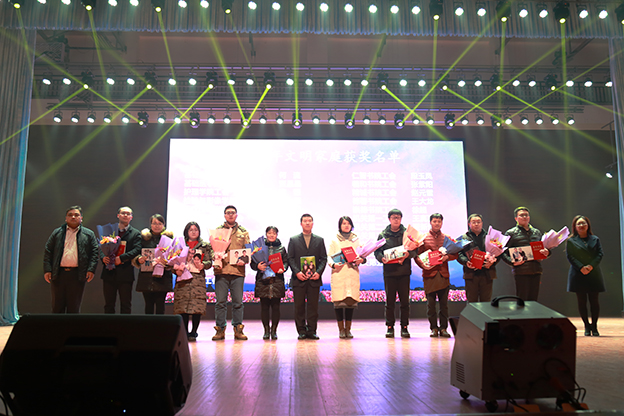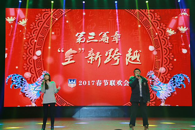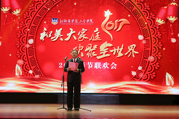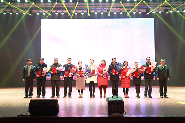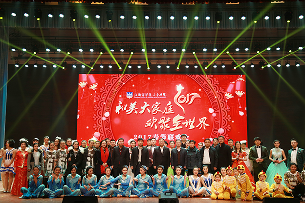 1月17日下午,我院2017“和美大家庭 欢聚’全’世界”教职工春节联欢会在平原校区闻德大礼堂隆重举行。学院领导与广大教职工欢聚一堂,喜迎新春。 一段开场视频带领大家回顾了2016年学院的发展历程,年度大事、师生活动、对外交流、学院荣誉,一幅幅画面令人振奋。优美的《水鼓舞》拉开晚会序幕。 晚会首先颁发了文明家庭、教职工五年和十年年资奖,院领导为获奖者颁发证书和鲜花。 院长杨捷致新春贺辞。他代表学院董事会、党委和行政,向恪尽职守、艰苦奋斗在教学、管理、服务第一线的教职员工表示美好的祝福和衷心的感谢,向坚守在工作岗位上而未能参加晚会的教职工表达敬意和问候。他指出,过去一年是我们各项事业取得全新突破的一年,学院以创建示范性应用技术院校为主线,转型发展初见成效。在新的一年里,要坚持战略转型不动摇,坚持改革创新不动摇,坚持共建和美大家庭不动摇,管好“家事”,做强“家业”,纯正“家风”,共建和美大家庭。 晚会分三个篇章:同襄盛举、共绘蓝图、全新跨越。在大礼堂的舞台上,歌曲、舞蹈、小品、朗诵等丰富多彩的节目依次上演,赢得阵阵掌声。相声《健康生活我要爱我》以网红“许别林”身体器官罢工为例,倡导“5125” 的健康生活理念;歌曲联唱《时光不老 我们不散》由学院老教授与年轻教师共同演绎,富有年代感的歌曲、戏剧让人回味无穷;舞蹈串烧《巡山舞》、《踩踩踩》、《小鸡小鸡》动感十足,欢快动人的节奏,生动形象的造型引观众捧腹;话剧《中华文明之美之敬业乐业杂谈》,以传统私塾的形式,颂扬了中华民资的传统文化;小品《家的谎言》,慈父花钱买儿陪伴,呼唤儿女们常回家看看、多陪伴父母;朗诵《在你身后陪你左右》,感人的字句、动情的诵读,与背景音乐和视频相得益彰,催人泪下;啦啦操《“全”舞时代》透露出青春的气息,流行歌曲对唱《一想到你呀》温馨暖人,舞蹈《冰菊物语》姿态柔美,优美动人。 晚会在歌曲《相亲相爱一家人》中圆满结束。院领导与全体演职人员合影留念。