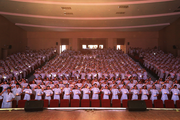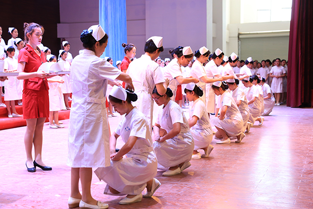 5月12日下午,我院在闻德礼堂隆重举办护生传光授帽仪式暨护理健康教育大赛。我院党委书记王志凯、副院长王彦杰,教务长杜华贞出席,各职能部门、书院负责人及近千名即将进入实习的护理学生参加。 仪式在激昂的大合唱《中国护士之歌》中拉开帷幕。首先,王志凯致辞,他对即将走上实习岗位的护理毕业生们寄予殷切希望,鼓励毕业生真诚地热爱护士职业,全身心地投入到护理职业,坚持播撒爱的种子,成就平凡而伟大的护理事业。 活动开始,参与合唱的白衣天使们分成两个方阵,微微倾斜,如同两只雪白的翅膀,提灯女神从中缓缓走出。授帽仪式在优美、安祥的“only time”乐曲声中开始。象征着传递火种的女神手提式火种台灯款款走上舞台,薛松梅教授走上台引燃火种点燃烛台。114名实习生代表身着洁白的护士服,依次缓缓走入会场,单膝跪地,虔诚地迎接着这一神圣时刻的到来。来自高校和临床一线的8位护理前辈,满怀深情与期望地为她们戴上圣洁的燕尾帽,把象征南丁格尔“燃烧自己,照亮别人”精神的火种传递到下一带护理人的手中。护理学院副院长王静带领所有实习生在南丁格尔像庄严宣誓,一句句掷地有声的南丁格尔誓言在闪烁的烛光中荡漾,回荡在上空,萦绕在现场每一个人的心中,激励学生为护理事业奋斗终身。 在德馨书院学生会表演的幽默歌剧《厉害了,我的歌》过后,迎来的是紧张刺激的健康教育模拟大赛,同学们将护理专业知识、护理技能操作、饮食疗法、心理护理、人文关怀融入其中。飞天小南警团队利用洗手操、健美操等大家常见的健身形式宣传一些医疗小知识。全馨爱团队利用动画片的卡通人物形式向大家展示怎样预防艾滋,怎样关爱艾滋患者,赢得了现场观众的阵阵掌声。最终,飞天小南警团队获得一等奖,护患一家亲团队,全馨爱团队获得二等奖,阳光天使团队、老王的甜蜜生活团队、南丁格尔小分队团队获得三等奖。 此次活动旨在使南丁格尔精神深深地烙印在每一位护生们的心中,用爱心、耐心、细心和责任心去认真对待照顾每一位病人,同时也使得同学们切身体会到护理事业的崇高,增强了护理人员的责任感。