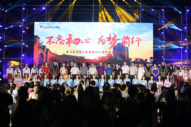 6月8日、9日晚,“不忘初心,为梦前行”欢送2017届毕业生毕业晚会先后在平原校区风雨操场和新乡校区篮球场隆重举行。 新乡医学院副校长郭志坤、原志庆、陈清江,我院党委书记王志凯、院长杨捷、党委副书记王金文、副院长王彦杰、党委副书记张钢、副院长沈雁霞、教务长杜华贞、后勤总监马波、学务长邱永建等分别出席两校区晚会,书院、院系、职能部门教师及全体毕业生观看了晚会。 晚会开始前,LED大屏幕上播放了我院近年来获得的多项荣誉及2017届毕业生在校期间的精彩表现,唤起大家对几年美好大学生活的回忆。晚会在舞台两侧设置了微博墙和微信墙,毕业生观看晚会同时可全程参与互动,发表自己的感受及对毕业生的祝福。 晚会以“不忘初心”为主题,分为三个篇章。一曲《骄傲的少年》开启了晚会的第一个篇章“追忆•全梦想”。代表中国参加2017-2018国际啦啦操比赛的街舞《MEMORY》,快速流畅的舞步伴以重鼓与电音以及多种乐器交杂的舞曲,展现了一种年轻人的骄傲与蓬勃。《戏曲联唱》抑扬顿挫的曲调,让听众再次忆起4年前迎新晚会上“萧何月下追韩信、霍元甲”的豫剧经典。 第二章章词“蜕变•全成长”。毕业生代表崔旭阳等同学共同朗诵《致我们深爱的母校》,一句句戳心的话语,勾起了青春的回忆,很多毕业生潸然泪下。“不要问我到哪里去,我的路上充满回忆,请祝福我,我也祝福你。”一首《绿叶对根的情意》表达毕业生对母校的感恩和不舍心情。 第三章章词 “启程•全世界”。合唱《彩虹》旋律动人,小品《不忘初心》,演绎校园趣事,引得观众连连叫好。“我们终将再分离,而我的自传里曾经有你,没有遗憾的诗句,诗句里充满感激。”《如果我们不曾不相遇》娓娓诉说着青春里的惊奇与情意。素颜青衫,青丝墨染,长袖飘逸,若灵若仙,舞蹈《为梦前行》,水的精灵仿佛从梦境中走来,展现了三全学子的活泼和坚韧。 伴随着吉他弹唱的优美旋律,毕业晚会落下帷幕。 据悉,演员们为演出准备了近一个学期,共230名毕业生参与演出,节目组力求节目具有创意,为毕业生留下美好回忆。毕业生们表示,时光飞逝,转眼就要毕业,大学生活美好而令人难忘;希望母校发展越来越好!”