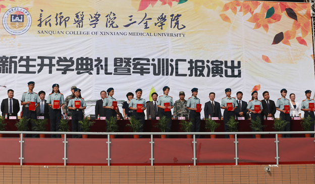 9月20日上午,我院2015级新生军训汇报表演暨开学典礼在平原校区体育场隆重举行。新乡医学院副校长、我院董事毛兰芝教授,我院党委书记王志凯、院长杨捷,中国人民解放军71481部队政治处主任卢常海、教导员耿伟生,我院党委副书记王金文、副院长秦国亮、副院长王彦杰、副院长王洪兴、党委副书记张钢、副院长沈雁霞,以及学院各教学院(系、部)、各党总支、各书院、各职能部门的负责同志,各位承训教官,2015级全体新生辅导员、教师代表,2015级全体本、专科新生参加本次仪式。仪式由院长办公室主任史世锋主持。 2015级新生首先进行军训汇报表演。经过部队教官严格训练,各书院同学在短短的九天里,出色地完成了跨立、齐步走、正步走、分列式等预定训练科目。受训新生军姿挺拔,迈着矫健的步伐正步通过主席台,接受学院和部队领导的检阅。在军训队列演示中,各小方队精神饱满,步伐矫健、口令准确、声音嘹亮。他们坚定的步伐、整齐划一的队形、嘹亮的口号,彰显了2015级新生艰苦训练的豪情和青春蓬勃的朝气。此外,承训教官展示的军体拳方阵更是赢得了全场热烈的掌声。 表演结束后,王金文宣读《新乡医学院三全学院关于表彰军训先进集体、先进个人的决定》,本次军训共有123名学员获军训优秀学员称号。出席领导为获奖者颁奖。王志凯代表学院向中国人民解放军71481部队赠送锦旗。 2015级新生开学典礼在《中华人民共和国国歌》声中隆重开始。 杨捷院长致辞。他代表学院全体教职工向2015级全体新生表示诚挚祝贺和热烈欢迎,向军训教官、老师表示衷心感谢,他向同学们介绍了学院的发展历程、办学成果。在大学的第一堂课上,杨捷鼓励大家“多读书”、“多旅行”、“多思考”。他希望同学们在学好专业知识的同时,尽可能广泛地涉猎其他学科知识;走出宿舍、走出校园,去外面的世界看一看,好好感受一下不一样的人生。他说,生活就像球赛,只有认清自己所处的位置,甘心做好分内的工作,才能发挥自己最大的价值;希望大家在闲下来的时候发发呆,从每一件平凡具体的小事中思考、发掘、沉淀人生的意义,不管是在学习还是生活中,都要思考每一个平凡的现象背后潜藏的深层次原因。最后,杨院长衷心祝愿2015级全体同学学有所成,书写美好青春。 硕士生导师、我院护理学院薛松梅副教授作为教师代表发言。她从“医者仁心”、“善者博学”、“智者恒心”三个方面向同学们讲述了该怎样度过大学生活。她勉励同学们要做一个具有人文情怀、追求创新的三全人。她表示,作为一名教师,会努力做到为人师表,勤奋工作,认真上好每一节课,真诚关爱每一位学生,做同学们的良师益友。 2015级新生代表齐文秀发言。她讲述了自己的“三全初体验”:刚离开父母的忐忑,学长学姐们的热情,美丽的校园带来的惊喜。她憧憬未来的大学生活,表达了自己的心愿,她将尽快适应大学生活,明确奋斗目标,把“成为适应社会需要的医学英才”作为自己最大的理想。 军训汇报暨开学典礼在一片欢呼雀跃中结束,这标志着2015级新生的大学生涯正式拉开帷幕。