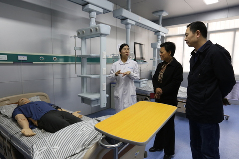 首先,胡喜霞一行参观了我校图书馆、护理实训中心、崇德书院;随后双方在行政楼第三会议室进行亲切交流,双方就各自基本情况做相关介绍,胡喜霞对我校办学理念、“双院制”育人模式、先进的教学设施等方面予以高度评价,希望双方在全过程教学基地建设、学生的实习就业、人才联合培养等方面进行深入合作。