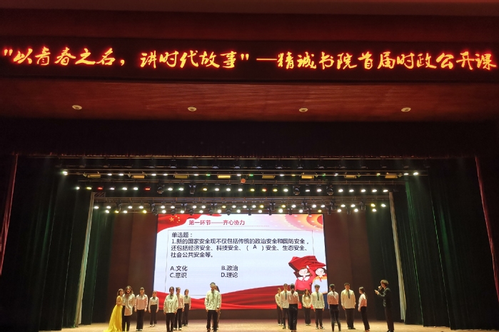 2020年11月6日,精诚书院于闻德礼堂举办首届“以青春之名,讲时代故事”时政公开课决赛,精诚书院全体老师与我校500余名学生共同参加 。 本次大赛邀请到我校团学组织中心史良、外事部马佳、党委宣传部吕娇楠、医学影像技术学院易东波、口腔医学技术学院薛青瑞担任评委。 经过前期层层选拔,共有追梦队、破晓队、时代青年队、sunrise队、三缺一队、全明星队六支队伍进入决赛,决赛分为“齐心协力”、“时政连连看”“时政我来讲”三个环节。 在“齐心协力”环节,6个代表队共进行了时政热点、《习近平治国理政》第三卷等知识的比赛。选手们信心十足,摩拳擦掌,为这场即将到来的“龙争虎斗”做了充足准备。比赛伊始,追梦队旗开得胜,为比赛博得了一个好彩头,拉开了竞争的序幕。随着比赛的进行,破晓队首先拿到第一环节的满分。接下来,各代表队更是使出了浑身解数,冷静思考,积极作答。比赛分数尽管各有得失,队员们依旧齐心协力,互补缺点,充分体现出了团队精神,赢得了评委和现场观众阵阵掌声。 此外,比赛还设置了观众有奖互动答题环节,现场观众热情高涨,悉数抢答,气氛火热。 在“时政连连看”环节,各队伍以原创报道、诗歌朗诵、情景剧、重温誓词、红歌等形式,还原再现了“中美贸易战”、“中国机长”、“建党伟业”、“疫情防控”、“直播带货助力果农”和“实地脱贫”六个时政事件。 “中美贸易战”以原创播报的形式,展现出“谈,我们大门敞开;打,我们奉陪到底!”的中国态度和民族底线!“中国机长”还原四川8633航班返航精彩片段,致敬了中国机长敬畏生命、敬畏责任、敬畏规章的坚守和执着;“建党伟业”分为五个场景真实再现中国共产党成立场景,深刻叙述了在百年前的中国,有志青年在民族危亡时的智慧与使命;“疫情防控”以我校优秀学子郝莺歌为原型,刻画了疫情当下,青年学子的“时不待我”的责任与担当;“脱贫攻坚助力果农”,将我院学生社会实践搬上舞台,展现出青年学生通过直播带货帮助果农处理滞销农产品的场景,助力疫情后的经济复苏;“实地脱贫”则是通过大学生党员结合自身专业特色,走村串巷慰问贫困户,主动融入脱贫攻坚和乡村振兴中,做好新时代的担当者和奋斗者! 经过前两个环节的激烈比拼,追梦队、破晓队、全明星队进入“时政我来讲”环节。三支队伍分别以“青年价值”、“青年奋斗”、“青年使命”三个主题进行现场公开课。“历史赋予使命,时代要求担当!我们当代青年应心系国家,心系无穷的远方和无数的人们,在努力和奉献中实现自己的人生价值!”追梦队公开课主讲人李杨慷慨激昂地说,尽显新时代青年敢于担当、勇于奋斗,将国家命运与个人前途休戚相关的锐气和勇气! 经过激烈角逐,破晓队获得一等奖,全明星队和追梦队获得二等奖,sunrise队、三缺一队和时代青年队获得三等奖。大赛在全场共唱《我和我的祖国》中圆满结束。 据悉,精诚书院首届时政公开课历时四个月,课程紧密结合书院家国情怀与价值理想通识教育,以《大学生公民人生教育》理论核心课为指导,与学习《习近平治国理政》有机结合,以千名学生共讲时事政治为着力点,从时事政策、公共话题、突发事件等大型选题中选取最新、最热、最快的时政话题。通过还原时事全貌、解读事件真相,以精度、纯度和锐度为导向,呈现当代大学生的主流价值观和责任与担当,从而培养学生融会贯通与辨析事理的能力,帮助青年一代树立与时代主题同心同向的理想信念,绽放青春的光芒! 本次活动由精诚书院团总支主办,精诚书院社团联合分会与思源社承办。