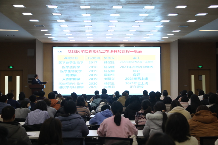 春回大地,万象更新。新学期伊始,为促进现代信息技术与教育教学融合创新,持续推进线上线下混合式“金课”教学改革与实践,有力加强我校课程建设,2月26日,由教务部、联合基础医学院共同举办的“金课”教学研究与实践专题报告会在行政楼三楼学术报告厅举行。基础医学院院长杨保胜为全校各教学单位青年教师带来了题目为“基于省级精品在线开放课程建设的线上线下混合式‘金课’教学研究与实践”的专题报告会。报告由基础医学院副院长李勇莉主持,全校各教学单位教师近200人参加。 杨教授一直以来致力于课程改革和建设,他结合自己主持的省级一流线上课程《医学分子生物学》、省级精品在线开放课程《医学遗传学》和《医学细胞生物学》的建设与体会,以及线上线下混合式教学等方面积累的丰富经验,就实现新技术与教育教学从深度应用向融合创新发展,构建以学习者为主体,开放、共享、交互、泛在的智慧教学新生态等方面与大家进行了分享。 会后,杨教授同参会的老师就线上线下混合式“金课”的申报和建设进行了深度的沟通和交流,并鼓励大家积极进行教学理念、教学方法、教学资源建设、教学评价与管理等方面的改革创新,老师们纷纷表示受益匪浅。 我校一直以来致力于课程改革的探索与实践。之后会继续加强课程建设、规范课程管理,并积极采用多种方式推广优秀课程,不断提高我校教学质量。