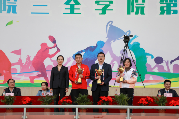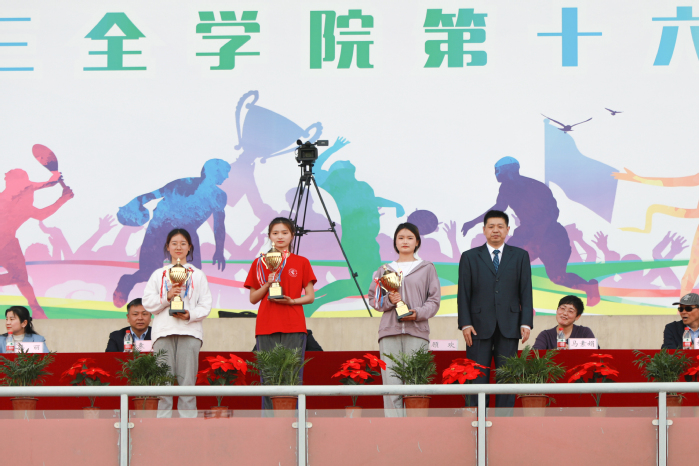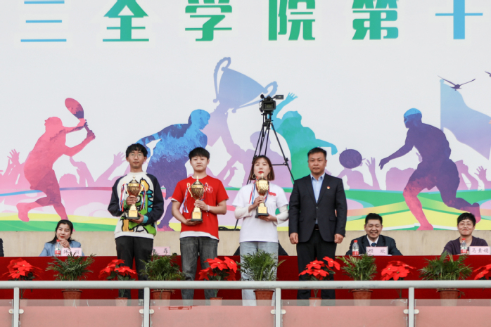4月16日下午,我校第十六届运动会在平原校区风雨操场圆满落幕。我校党委副书记、工会主席吕莎,副院长顾欢,副院长袁磊及相关部门负责人出席闭幕式。各院(系、部)、书院和职能部门的负责人及运动员代表队2000余人参加。闭幕式由院长办公室主任助理申大鹏主持。 体育部主任杨晓林宣布各项比赛成绩。羲和书院代表队、德馨书院代表队、智行书院代表队分别获得“学生组男子团体总分”前三名;羲和书院代表队、智行书院代表队、仁智书院代表队分获“学生组女子团体总分”前三名;羲和书院代表队、智行书院代表队、德馨书院代表队分获“学生组男女团体总分”前三名;精诚书院工会代表队、羲和书院工会代表队、崇德书院工会代表队分别获得“职工组团体总分”前三名。仁智书院代表队获得“学生组精神文明奖”,机关第一工会、护理学院工会、智行书院工会、马克思主义学院工会、临床学院工会、基础医学院工会获得“职工组精神文明奖”,出席领导为获奖团体颁奖。 顾欢致闭幕词。顾欢对获得优秀成绩的运动员及集体表示热烈的祝贺,对为本次运动会辛勤工作的教职工人员和志愿者表示衷心的感谢。他对在场师生提出三点希望,一是提升全面综合素养,将体育精神运用到学习、工作和生活中,努力成长为德、智、体、美、劳全面发展的新时代有为青年;二是塑造体育健康形象,养成良好的体育锻炼习惯,推进全民健身运动和阳光体育运动,助力健康中国建设;三是以本次运动会为契机,认真总结经验,努力开展更加丰富多彩的体育活动,切实增强师生的凝聚力、向心力,实现运动成绩和精神文明双丰收;最后,顾欢向辛勤付出努力的裁判员、运动员、志愿者们表示由衷的感谢,希望大家积极锻炼身体,做到“每天锻炼一小时,健康工作五十年,幸福生活一辈子!” 本届运动会组委会主任委员袁磊宣布第十六届运动会圆满闭幕。 据悉,在本次运动会中,无论是幕后默默无闻的工作人员,还是赛场上奋力拼搏的运动健儿们,都充分展现了我校师生积极向上、自强不息的精神风貌;全校师生共同努力,上下一心,充分展现了我校精益求精,追求卓越的优秀校风;运动健儿在赛场上的奋勇争先,激情昂扬,也让我们看到了三全学子朝气蓬勃的活力和朝气。