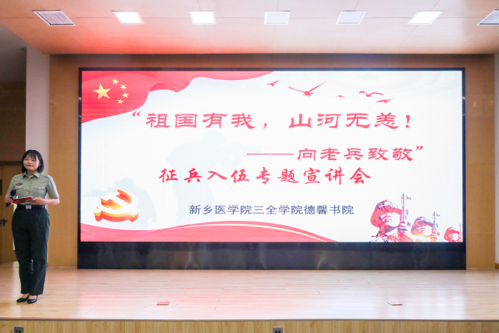 为进一步激发适龄青年报效祖国、应征入伍的热情,帮助他们了解、掌握应征入伍的相关政策,5月27日,新乡医学院三全学院学务部大学生就业创业指导服务中心、征兵办公室联合德馨书院在学术报告厅举办了“祖国有我,山河无恙——向老兵致敬”征兵入伍专题宣讲会。 此次会议特别邀请了中印边防退役老兵孟溪同志和黑河边防退役的德馨书院优秀退伍大学生徐鸿同志。原阳县人武部政工科科长王波、德馨书院党总支副书记平丹丹以及全校学生代表200余人参加,会议由新乡市征兵宣讲团成员、我校优秀退伍大学生士兵刘欣主持。 宣讲会伊始,作为一名曾经在部队获得过集体二等功,三等功的光荣士兵,孟溪向在场师生声情并茂地讲述了自己跟随部队紧急行军到中印边境加勒万河谷的经历。在场师生跟随着他的讲述,仿佛看到祖国边防界碑的感动和高原驻训的艰辛,爱国之心熊熊燃烧。他说道:“参军给自己带来了身体、精神和专业技能上的提高,不仅如此,更是让我在军队中收获与战友真挚而宝贵的感情,这些都是我一辈子的财富。” 在随后的访谈中,2018年9月入伍的徐鸿分享了自己从懵懂的入伍新兵,到边防卫士,再到屡获荣誉,成为一名优秀军人的亲身经历,他用幽默亲切的话语,为大家讲述了自己在军队中的训练和生活,分享了黑河边疆驻地的环境,部队的训练日常,自己退伍复学后心态的变化等同学们所关心的内容。 2020级健康管理专业的学生崔璨说道:“从两位老兵的讲述中,我们近距离的接触到了部队的生活,触碰到了军人的勇毅。我从他们身上感受到了‘一朝入伍终身为兵’的信念,祖国有我,山河无恙!” 最后,王波和征兵办公室周开放老师为大家做了入伍的相关政策的详细解读。现场学生踊跃提问,积极发言,更加深入地了解了应征入伍相关事宜。现场响起伴奏,老兵和师生共唱《祖国不会忘记》,宣讲会在嘹亮的歌声中落下了帷幕。 本次“祖国有我,山河无恙”宣讲会在落实国家征兵要求的同时,进一步加深了适龄青年对国家征兵政策的了解,加强了学生对参军报国的责任感和使命感,激发了他们投身军营、报效祖国的热情。